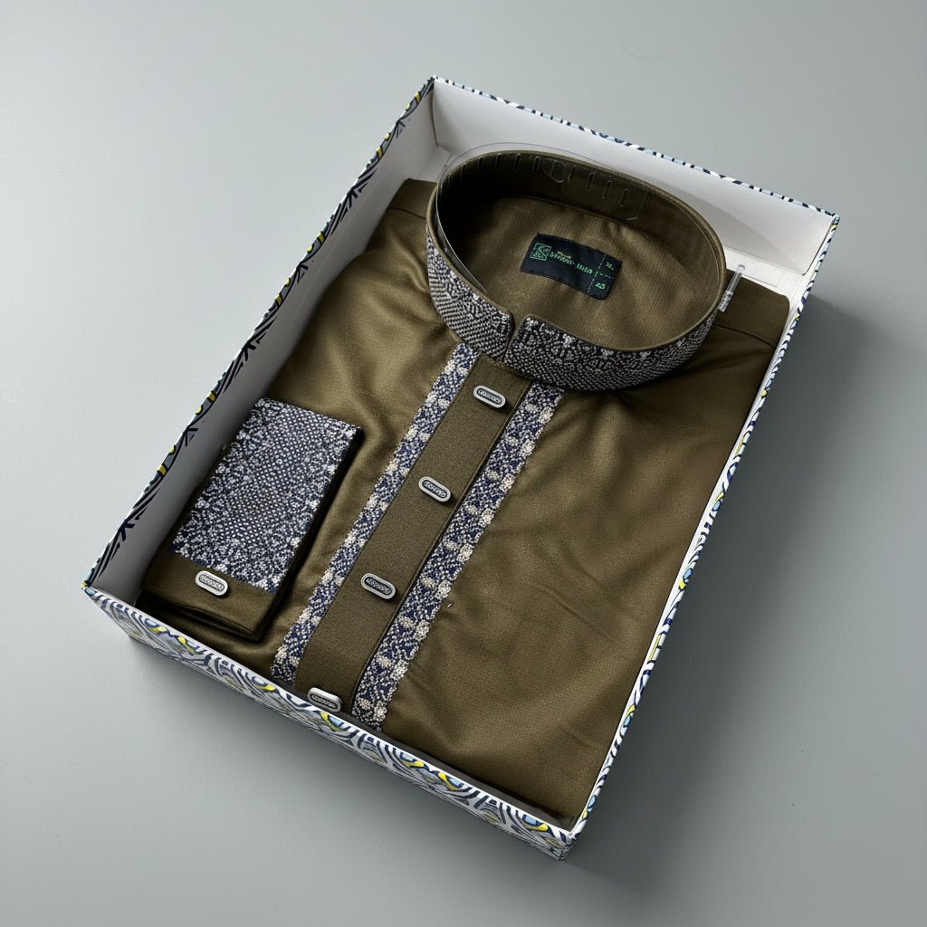 Artisanal Embroidery: Features high-finishing, intricate geometric embroidery patterns in a contrasting black-and-cream (appearing as deep navy/silver in certain lighting) palette on the collar and placket.