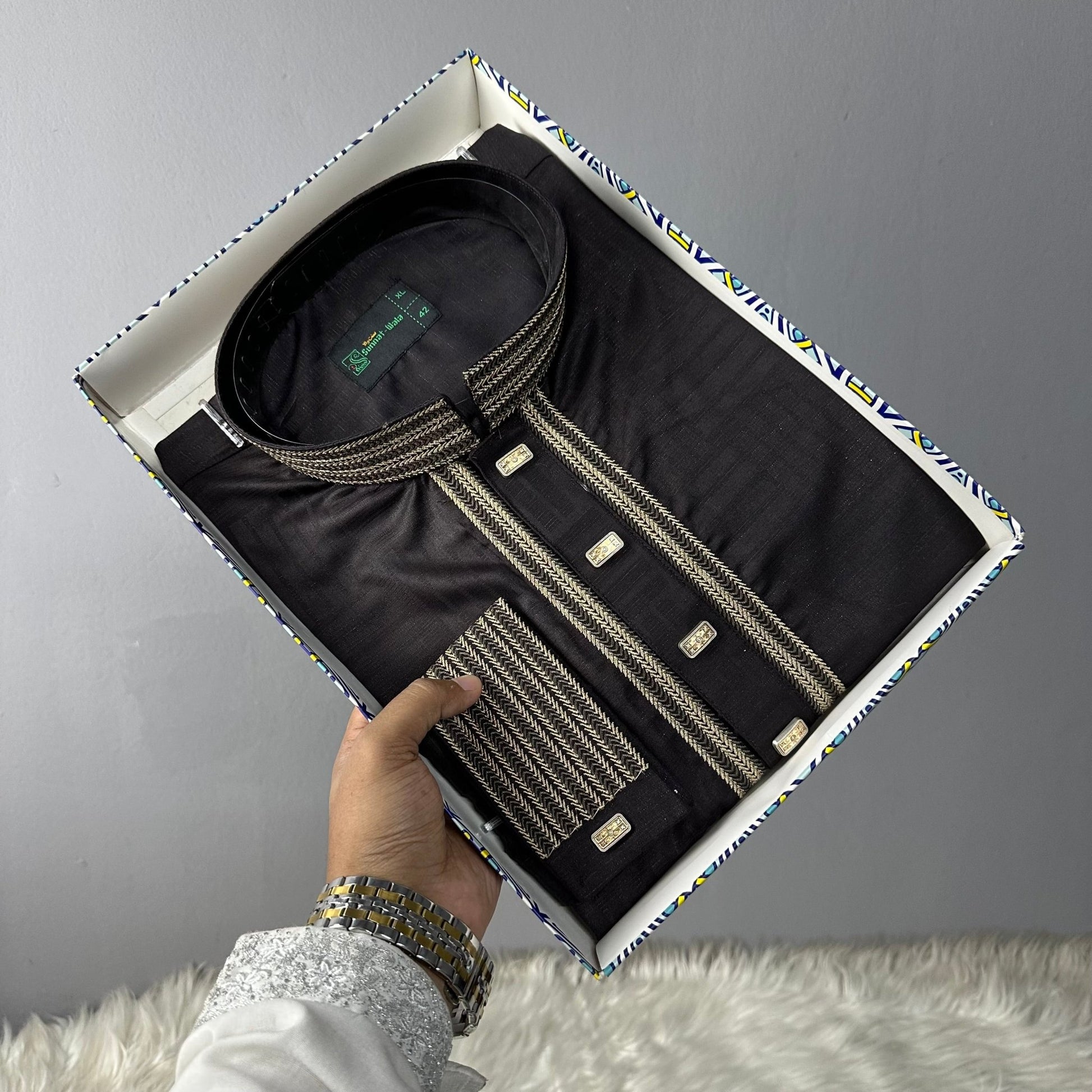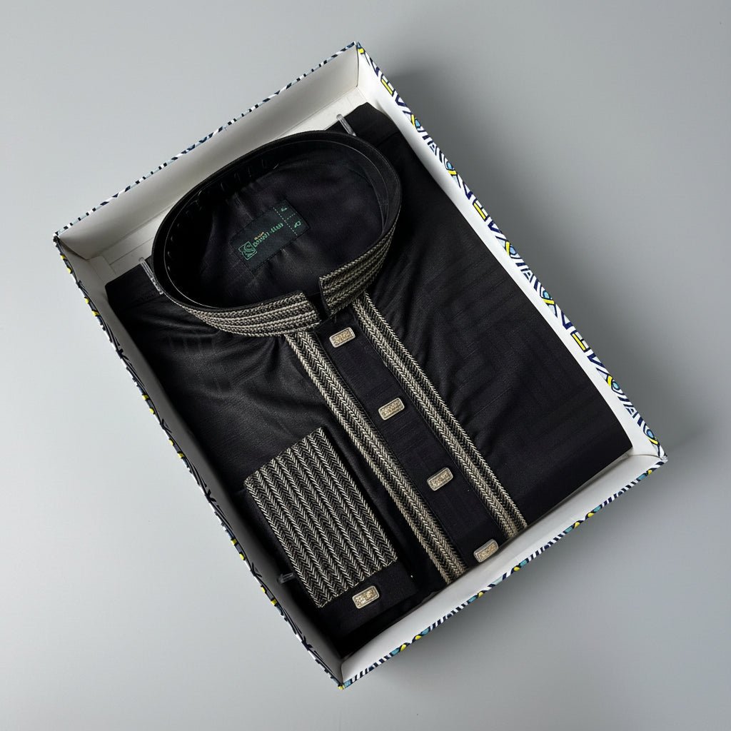 Artisanal Embroidery: Features intricate, high-definition geometric embroidery patterns in a sophisticated black-and-cream contrast.