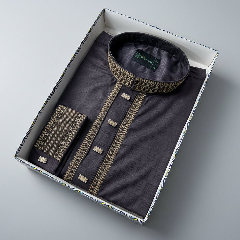 Artisanal Embroidery: Features high-finishing, intricate geometric embroidery patterns in a luxurious antique gold palette on the collar and placket.